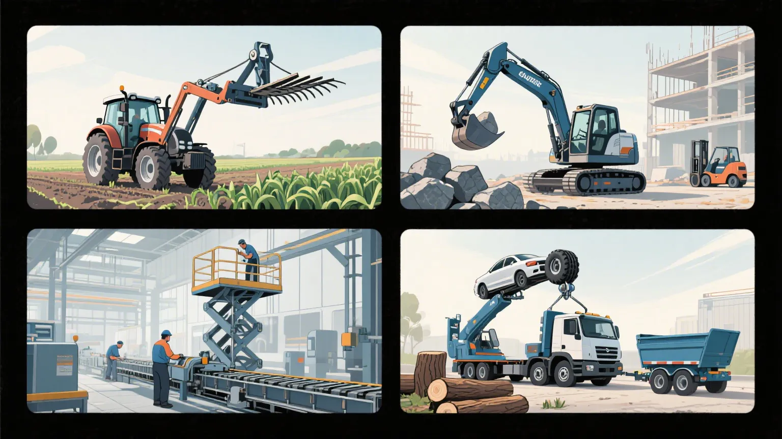 Во изградбата и ракувањето со материјалите, тоа е исто толку корисно. Управувачите за лизгање зависат од овој тежок хидрауличен цилиндар за подигање за да се движат корпи, брави и шпорети - тешки работи на кои им е потребна постојана моќност. Го користат и малите вилушкари, за подигање и навалување на јарболот, така што палетите одат точно каде што треба. Воздушни работни платформи? Механизмите за ножици кај помалите лифтови се потпираат на неговата прецизност за безбедно подигање и спуштање. Дури и подвижните ленти остануваат затегнати и ефикасни, благодарение на овој хидрауличен цилиндар за подигнување што ги затегнува задачите без пречки.