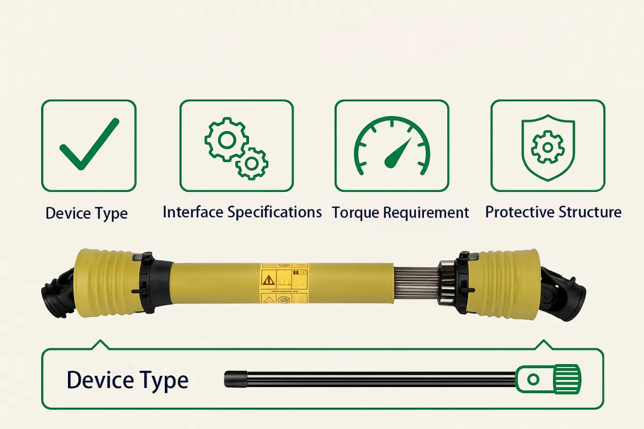 Прво, потребно е да се потврди типот на земјоделска механизација што треба да се приклучи. Различна опрема има различни барања за структурата, должината, формата на интерфејсот итн. на вратилото PTO. На пример: хоризонталните мешалки за напојување обично бараат PTO вратила со завртки за смолкнување или заштита од спојката; тркалезни балиери се посоодветни за модели со вкрстени универзални зглобови за да се справат со работните услови со чести промени на аголот; и за опрема како што се влечни ѓубрива, треба да се обрне внимание на слободното продолжување и повлекување на вратилото за да се осигура дека вратилото не е скршено при вртење или преминување на ров.